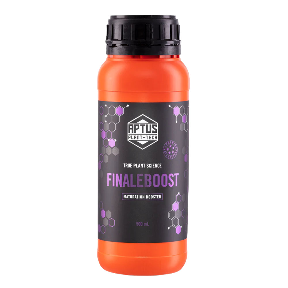 Aptus FinaleBoost 500ml Finaleboost along with its sibling product Peakboost make up the Aptus flower development and bulking solution. Perhaps the most noticeable implementation of the Third Pillar of Aptus Philosophy: Mineral Antagonism. Finaleboost moves the vast majority of potassium used during the bloom cycle solely into one product. With this formulation, Aptus has allowed for absolute control of heightened potassium application throughout the specific phases of a plant’s growth cycle. On top of allowing for specific potassium application in consideration of your plant genetics, stage in the growth cycle, or desired flower set behavior, the potassium in Aptus Finaleboost is chelated into an organo-mineral product. With the addition of L-amino acids, the potassium has eyes only for the plants’ roots and has a much smaller chance of being affected by outside factors. The specific application of chelated potassium allows for optimal health by removing the negative antagonistic effects of cheap bulk products containing high amounts of both potassium and phosphorous. With Aptus Finaleboost, you will see the difference in your final harvest by having optimal chelated potassium with the elements usually antagonised away including: nitrogen, calcium and magnesium. It’s no wonder some manufacturers want you to load up on cal-mag in bloom.