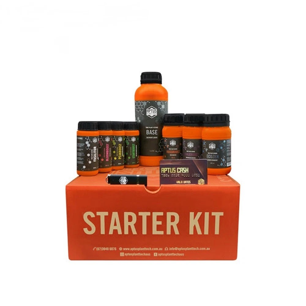 The Aptus Starter Kit contains a 1L Base, 100ml Fasilitor, 100ml Startboost, 100ml Bloomboost , 100ml Peakboost , 250ml Massboost, 250ml Ecozen and 250ml Finaleboost as well as a USB with all of their in-house feed schedules.