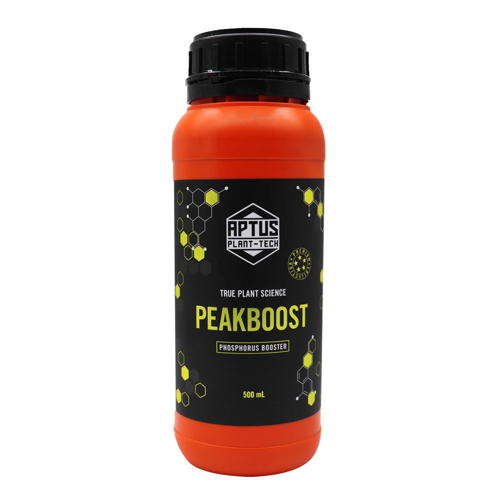 Aptus PeakBoost 500ml Peakboost along with its sibling product Finaleboost make up the Aptus flower development and bulking solution. Perhaps the most noticeable implementation of the Third Pillar of Aptus Philosophy: Mineral Antagonism. Peakboost moves the vast majority of phosphorous used during the bloom cycle solely into one product. With this formulation, Aptus has allowed for absolute control of heightened phosphorus application throughout the specific phases of a plant’s growth cycle. On top of allowing for specific phosphorous application in consideration of your plant genetics, stage in the growth cycle, or desired flower set behavior, the phosphorous in Aptus Peakboost is chelated into an organo-mineral product. With the addition of L-amino acids, the phosphorous has eye’s only for the plants’ roots and has a much smaller chance of being affected by outside factors. The specific application of chelated phosphorous allows for optimal health by removing the negative antagonistic effects of cheap bulk products containing high amounts of both phosphorous and potassium. With Aptus Peakboost, you will see the difference in your final harvest by having optimal chelated Phosphorous with the elements usually antagonised away including: zinc, iron and copper.