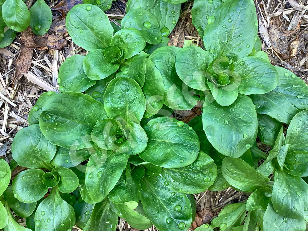 Also called Lamb's Lettuce, mache and rapunzel, looks like a small loose-leaf lettuce with broad smooth light green leaves, harvest outer leaves as needed, use in salads or cooked like spinach, high in vitamin C. Sow in cooler months, it is cold tolerant. 45-60 days.