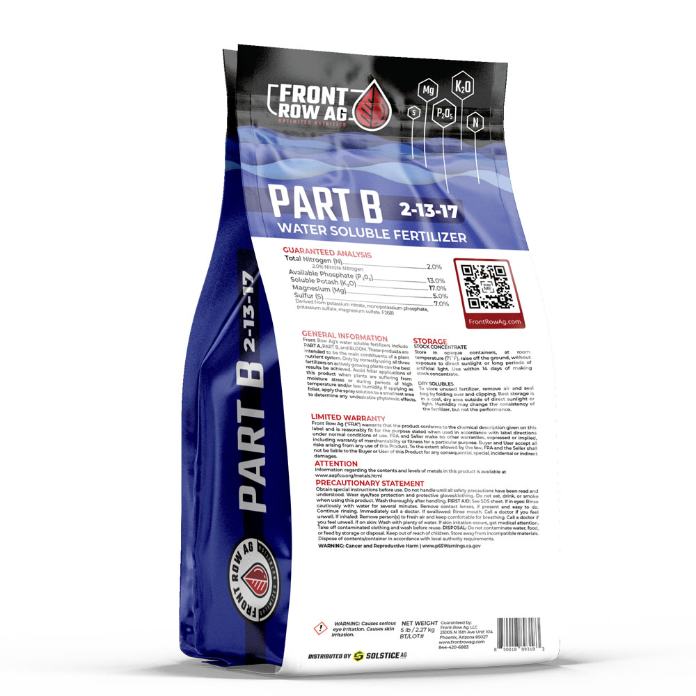 Part B complements Part A by delivering the essential concentrations of magnesium and sulfur as well as ideal volumes of potassium and phosphorus to ensure optimized photosynthesis. Within Part B, a blend of surfactants evenly distributes fertilizer ions and water while conditioning the medium to hold more oxygen. Finally, our proprietary solutionizing agent drives cation uptake ensuring unparalleled solubility.