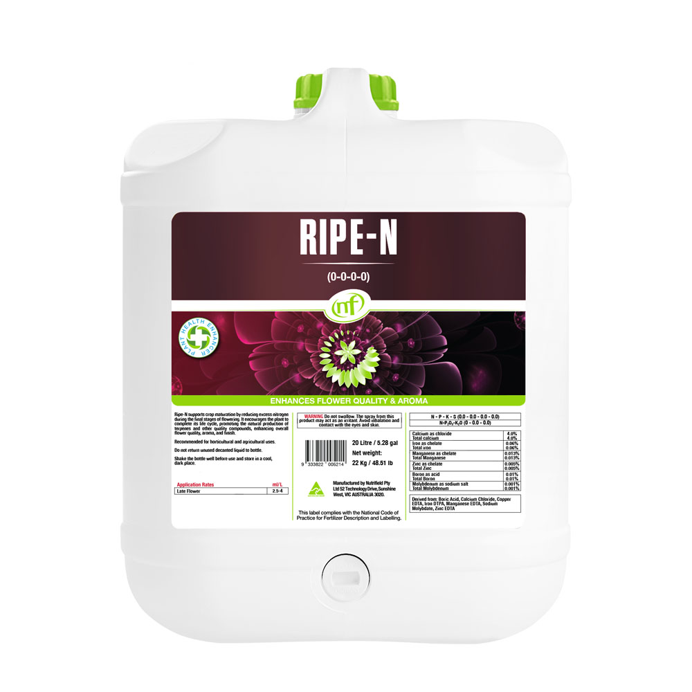 Ripe-N® is a late-flowering nutrient designed to guide plants through the final stage of growth, replacing standard base feeds to support controlled ripening and crop maturity.